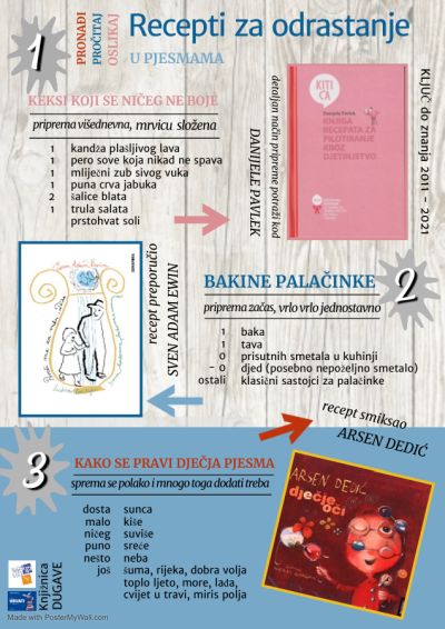 Pjesnici su napisali recepte za odrastanje, neki vrlo jasno pa ih je lako odmah pronaći, a neki skrovito pa ih treba malo duže tražiti. Posudite predložene zbirke pjesama ili pronađite neke druge hrvatskih autora, oslikajte ih i ukratko napišite sastojke recepata za odrastanje! Oslikane recepte, kao i one napisane u formi kulinarskih recepata, donesite u knjižnicu Dugave ili skenirane pošaljite na mail: majda.bakic@gmail.com