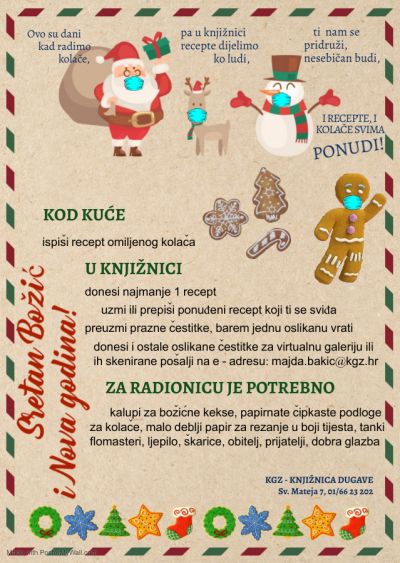 U prvom dijelu "slatke likovnice" prikupljamo recepte kolača iz cijeloga svijeta - iz kuharica, s interneta, slastičarnica i naravno, iz kuhinja vaših baka i mama (i ponekog tate i djeda). Zamolite ukućane da vam pomognu prepisati recept za vaš omiljeni kolač, donesite ga u knjižnicu, a mi ćemo ga staviti na našu virtualnu slatku kuharicu uz poeziju o ljubavi koju također možete sami pisati ako vam dođe pjesnička inspiracija. U knjižnici možete uzeti neki drugi recept koji vam se sviđa i doma ga probati napraviti za predstojeće blagdane, također možete uzeti podloge za čestitke, doma ih ukrasiti uz pomoć kalupa za kolače i obavezno jednu čestitku donijeti za knjižnicu, a ostale skenirati i poslati za našu virtualnu galeriju. U drugom dijelu čitamo "preeegenijalnu" slikovnicu - "Lunch at 10 Pomegranate street" - u kojoj ćemo naučiti recepte iz svih krajeva svijeta. Uskoro detalnjije informacije o terminima čitanja, sad najprije na posao prikupljanja slatkih recepata i izrade čestitki. Vidimo se! Sve radove možete poslati skenirane na e - poštu: majda.bakic@gmail.com