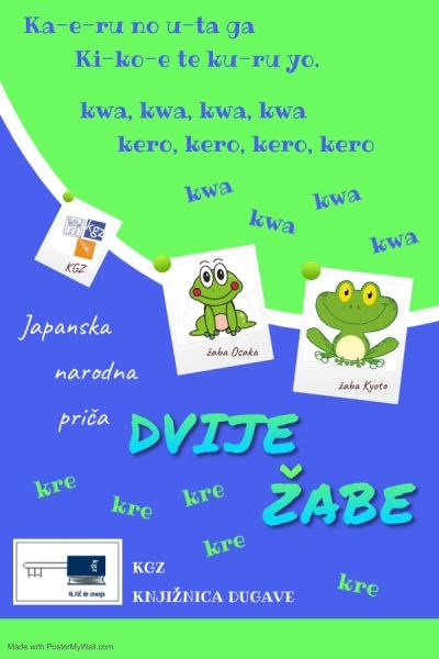 Pozivamo vas u carstvo Knjigozemlja u kojem čitamo i predstavljamo priče na neobične načine. Povodom tradicionalne japanske jeseni u knjižnici Dugave prepričali smo japansku poučnu narodnu priču Dvije žabe u obliku prezentacije. Prezentacija je dostupna na našim stranicama. Ukoliko ste zainteresirani dogovorite na vrijeme termin za čitanje u knjižnici u kojoj vas još očekuje niz zabavnih iznenađenja, poput natjecanja origami žaba u skoku u dalj na kraju radionice. Priča je prikladna za starije grupe vrtićanaca kao i za niže razrede osnovne škole. Irasshaimase! Kre! Kre!