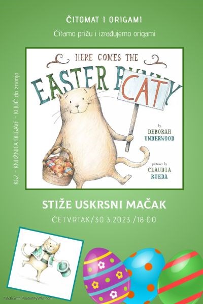 Čitamo slikovnicu Stiže Uskrsni mačak, autorice Deborah Underwood, ilustratorice Claudie Ruede. Poslije čitanja izrađujemo prikladni origami: uskrsne pisanice, Uskrsnog zeku i naravno - Uskrsnog mačka! Pridružite nam se!