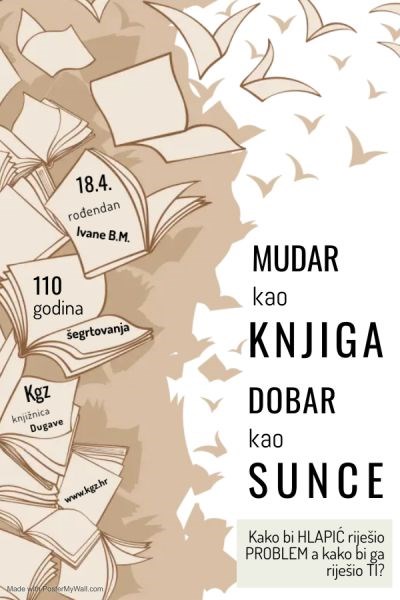 Pridružite nam se na radionici Knjigozemlje - Mudar kao knjiga, dobar kao sunce na kojoj rješavamo postavljene probleme, i to dvojako: na način kako bi ih riješio Hlapić i kako bismo ih riješili mi ukoliko se ne slažemo s Hlapićevim rješenjem. Radionica je prikladna za učenike trećeg i četvrtog razreda osnovne škole, odnosno za sve one koji su pročitali Čudnovate zgode šegrta Hlapića, šegrta čije zgode pomažu u rješavanju učeničkih problema već 110 godina. Radionica se održava na Dječjem odjelu knjižnice od 18.travnja, rođendana Ivane Brlić - Mažuranić, do 31. svibnja.