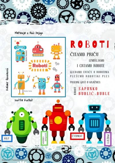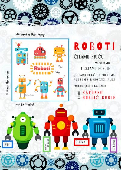 ↵Pozivamo vas na robotsku radionicu posebno dizajniranu povodom Noći knjige, 2023. U Čitomatu smo pronašli Robote Kašmira Huseinovića i Ivette Korbut. Poslije čitanja izmišljamo, zamišljamo i dizajniramo svoje robote, zatim na internetu gledamo super crtiće o robotima, te na kraju plešemo robotski ples i družimo se s malim robotom. Da, dobro ste pročitali - pravi robot Sapunko Bublić, poznat kao Buble dolazi nam u goste. Kako izgleda, što će radi u knjižnici - saznat ćete ako nas nazovete i dogovorite radionicu za djecu vrtićkog uzrasta i učenike prvog i drugog razreda osnovne. Pozz Pozz ili Bubl Bubl!