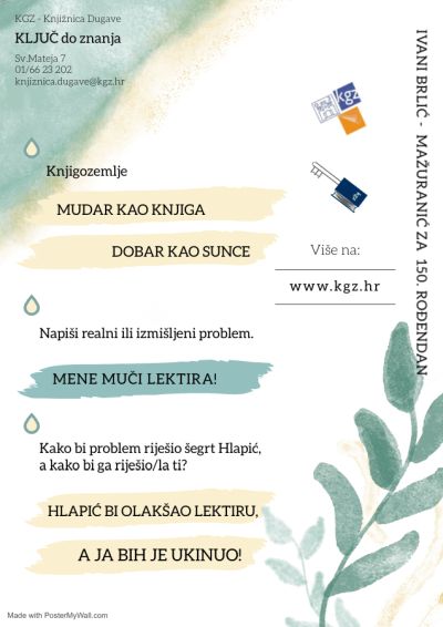 Povodom 150. rođendana Ivane Brlić-Mažuranić održavamo radionice Knjigozemlja: Mudar kao knjiga, dobar kao sunce na kojoj rješavamo učeničke probleme. U tome nam pomaže šegrt Hlapić već 111 godina, od toga u Knjižnici Dugave punih 11 godina. Radionice su prikladne za učenike trećih i četvrtih razreda osnovne škole. Molimo za detaljnije informacije pogledajte našu stranicu Knjigozemlje i pronađite superjunaka Hlapića i nazovite nas poradi daljnih dogovora. Radionice ćemo održavati do kraja mjeseca svibnja.