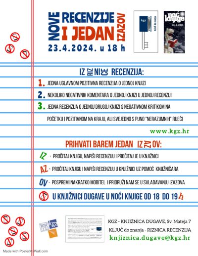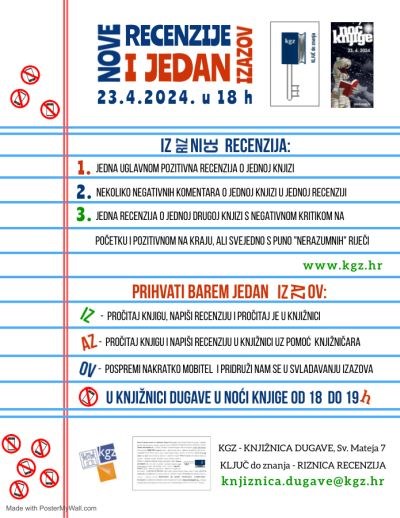 Pročitajte nove recenzije iz naše Riznice recenzija i prihvatite barem jedan navedeni izazov u Knjižnici Dugave na Odjelu za djecu i mladež, u Noći knjige u 18 sati, ili nam se samo pridružite u proslavi knjige!