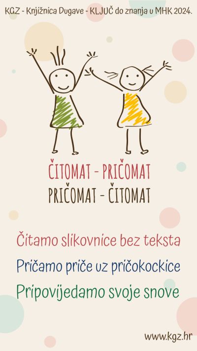 U Mjesecu hrvatske knjige naš se Čitomat malo pretvara da je Pričomat, pa vam stoga nudimo čitanje, odnosno pričanje priča preko slikovnica bez teksta, preko pričokockica ili pripovijedanje svojih snova. Družimo se u knjižnici (i virtualno) do kraja godine! Zapišite priče ili ih snimite, prepričajte svoje snove s djecom i pošaljite ih za našu novu zbirku Pričomata. Pridružite nam se!