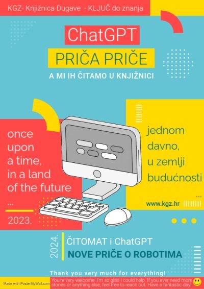 Na radionicama Čitomata, ChatGPT nam opet priča priče o robotima za isti uzraste kao i godinu dana prije i mora se primijetiti - poboljšao je svoje pripovijedanje, a čak nam je na kraju svake priče istaknuo poruku ili više njih u slučaju da ih ne možemo sami razabrati. Priče ćemo čitati u knjižnici, a oslikavati u vrtiću i školi ili kod kuće. Vaše ćemo radove postaviti u virtualne galerije! Pridružite nam se!