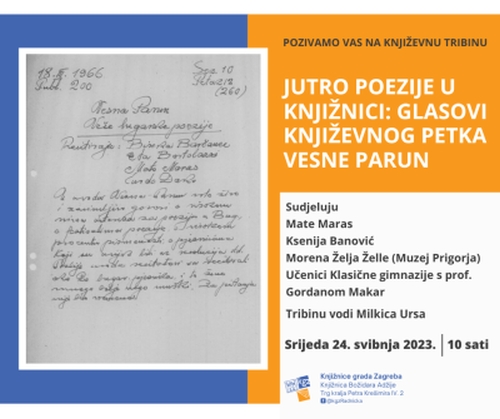 Vesna Parun, hrvatska književnica i prevoditeljica (1922. – 2010.), jedna je od osnivača književne tribine Jutro poezije, najstarije poetske tribine koja se održava do danas, a koju su uz nju pokrenuli 1964. godine Gustav Krklec, Vjekoslav Majer, Salih Alić, Berislav Nikpalj. Tribinu su nastavili voditi, između ostalih, Saša Meršinjak, Ružica Orešković, Robert Roklicer itd., a trenutačno je vodi Željko Buklijaš. Javnosti je Vesna Parun poznata po životu koji je vodila na margini hrvatskih, pjesničkih društava, premda je najprevođenija hrvatska pjesnikinja i pripada joj veliko poglavlje suvremenoga pjesništva. I sama je prevodila, osobito bugarske pjesnike jer su je životne okolnosti vezivale uz Bugarsku. Na Književnom petku u Radničkom domu 1966. godine održala je predavanje na temu „Veče bugarske poezije“ o poslijeratnim bugarskim pjesnicima, i govorila o sličnosti i razlikama ta dva, po mnogo čemu, slična jezika. U Knjižnici Božidara Adžije 24. svibnja 2023. godine o istoj temi govorit će sudionik tadašnje tribine, književnik i prevoditelj, Mate Maras, a poslušat će se i dio snimke s tog Književnog petka iz 1966. godine. Na taj način približava se sadržaj digitalizirane zagrebačke baštine korisnicima, lokalnoj i široj zajednici, skreće se pozornost na snimljenu i sačuvanu arhivsku građu Književnog petka, koja se može preslušati u knjižnici i koristiti pri istraživanju, te potiče i na čitanje poezije.Projekt Digitalizirane zagrebačke baštine Knjižnica grada Zagreba, započinje u ožujku 2017. godine, i obuhvaća digitalizaciju zvučnih zapisa iz zbirke Arhiv Književnog petka knjižnice Božidara Adžije, magnetofonske trake i audiokasete snimljene na tribinama Književnog petka u razdoblju od 1957. do 1969. godine.