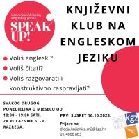 U suradnji sa "Speak up! konverzacijski tečaj engleskog jezika" započinjemo s književnim klubom na engleskom jeziku. U malim grupama od do najviše 5 sudionika, učenici razvijaju ne samo ljubav prema čitanju, nego i sposobnost kritičkog razmišljanja, samopouzdanje, i empatiju analizirajući i raspravljajući o književnim djelima na engleskom jeziku. Postanu dio zajednice čitatelja u kojoj stječu sigurnost u izražavanju vlastitog mišljenja u sigurnom okruženju dok uživaju u čitanju, druženju i zabavnim raspravama o djelima koji zajedno odabiru kao klub.Klub je namijenjen učenicima od 6. do 8. razreda osnovne škole, a prvi susret kluba je u ponedjeljak, 16.10. u 18 sati.