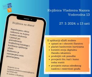 Započinjemo ciklus radionica na kojima nudimo edukaciju i pomoć pri pretraživanju knjižničnog kataloga i korištenje aplikacije eZaKi. Radionica je namijenjena svim generacijama.Prijave na: knjiznica.vladimira.nazora@kgz.hr, 01/3703-414 ili osobno u Knjižnici.