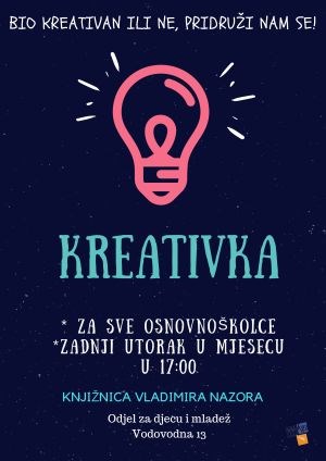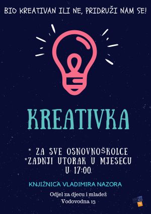 Kreativne radionice za sve osnovnoškolce koji misle da su kreativni i za sve one koji misle da možda to i nisu.Budite dio Kreativke svaki zadnji utorak u mjesecu .