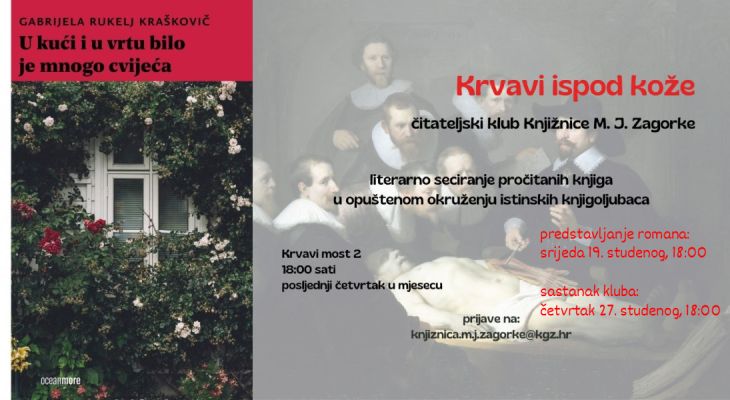 Za susret našeg kluba u studenom s posebnim zadovoljstvom najavljujemo roman „U kući i u vrtu bilo je mnogo cvijeća” Gabrijele Rukelj Kraškovič koji je gotovo u cijelosti napisan u prostoru čitaonice naše knjižnice. Njen originalan, nesputan i nadasve iskren autorski glas kao da izranja iz prostora duboko proživljenih životnih iskustava donosi jednu posve novu definiciju obitelji ali i odrastanja u zagrebačkom miljeu čija je autentičnost dodatno istaknuta memorabilijama jednog vremena među kojima posebnu ulogu igra glazba. Sve članove kluba također pozivamo da nam se u srijedu 19. studenog u 18 sati pridruže i na predstavljanje romana uz nazočnost autorice, a na redovitom sastanku kluba u četvrtak 27. studenog slijedi razgovor o pročitanom djelu.
