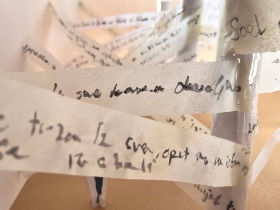 Umjetnica se ne zaustavlja na tekstu kao elementu izgradnje poetičnog prostora, već se otvara prema promatraču i upućuje ga na čitanje pozicije subjekta u kojem je prostorni kolaž, verbalizirani prostor taj koji omogućuje osobni iskaz. Tekst predstavlja svakodnevne misli prenesene, ovom slučaju završnog diplomskog rada, u galerijski prostor kao sigurno mjesto za otvaranje i ispisivanje misli. Selidbom iz vanjskog prostora vrta i šume u galerijski prostor ne prekida s poetičnom vizualnošću prostora koje stvara, već u “šumi stupova” u galerijskom prostoru stvara mrežu tekstualnih poruka kojim kreira ambijent za ispisivanje svakodnevnih misli na što ukazuje i sam broj iz naslova Misli 365, aludirajući na dane u godini tj. svakodnevicu.