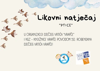 Pozivamo dječje vrtiće da se prijave na likovni natječaj "Ptice", kojega povodom 50. rođendana organizira DV Vrapče u suradnji s Knjižnicom Vrapče. Izložba radova održat će se u našoj knjižnici nakon završetka natječaja.Detalji natječaja dostupni su ovdje!