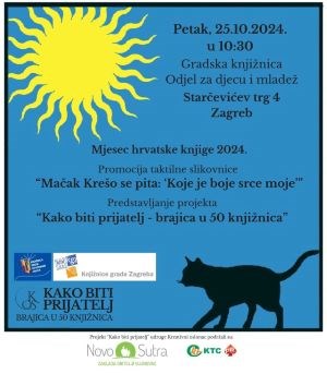 Promocija taktilne slikovnice „Mačak Krešo se pita: „Koje je boje srce moje“, autorice Jasmine Kos nastale u sklopu projekta „Kako biti prijatelj - brajica u 50 knjižnica“ udruge Kreativni oslonac. Nakon promocije slijedi inkluzivna radionica upoznavanja s pismom slijepih i jezikom gluhih te odnosa prema osobama s invaliditetom.