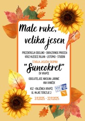 U izložbi „Male ruke, velika jesen” predstavljamo djecu starije jasličke skupine našeg vrtića te njihov svijet istraživanja, igre i stvaranja kroz mjesece rujan, listopad i studeni. Kroz različite aktivnosti - likovne, glazbene, istraživačke i tjelesne - djeca su upoznavala promjene u prirodi, boje i mirise jeseni, razvijala finu motoriku, suradnju i samostalnost.