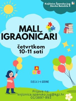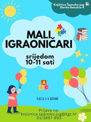Igraonica za djecu od 3 do 4 godine. Igraonica će se održavati svake srijede u 10 sati. Prvi termin je 24.9. Igrajmo se, čitajmo i učimo zajedno!