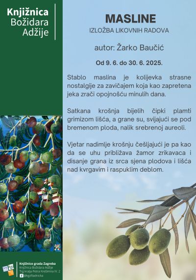 U Slobodnom pristupu Knjižnice Božidara Adžije postavljena je izložba likovnih radova Masline slikara Žarka Baučića.