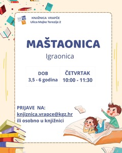 Dragi roditelji, započinjemo s novim programom u našoj knjiižnici.Maštaonica je igraonica namijenjena djeci koja ne idu u vrtić (uzrast 3,5 do 6 godina), a održavat će se četvrtkom u jutarnjem terminu.