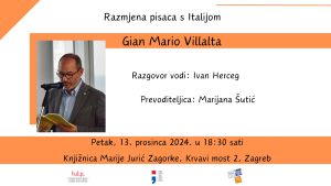 U sklopu međunarodne razmjene pisaca ugostit ćemo talijanskoga pisca Gian Mario Villalta, ujedno i umjetničkog direktora festivala Pordenone legge te ćemo s njim razgovarati o njegovu književnom radu, festivalu koji priprema i vodi, talijansko-hrvatskim književnim vezama. Autor će pročitati i više svojih pjesama koje je za ovu prigodu prevela Marijana Šutić. Događaj će moderirati Ivan Herceg.