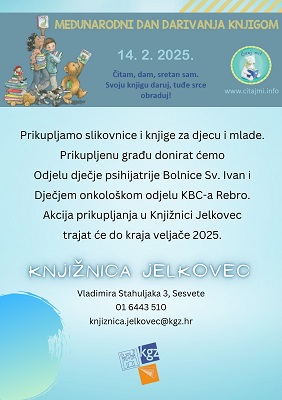 Pozivamo sve koji to žele da daruju slikovnice i knjige za djecu i mlade u Knjižnicu Jelkovec do 28. 2. 2025., a mi ćemo ih proslijediti Odjelu dječje psihijatrije Klinike za psihijatriju „Sveti Ivan” i dječjem onkološkom odjelu KBC-a Zagreb.