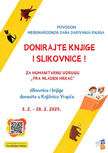 Pozivamo vas da se povodom Međunarodnog dana darivanja knjigom pridružite akciji prikupljanja slikovnica i knjiga za Humanitarnu udrugu fra Mladen Hrkać. Ova udruga, osnovana 16. lipnja 2012. godine, pomaže osobama sa zdravstvenim poteškoćama i njihovim obiteljima koje dolaze u Zagreb na liječenje.Slikovnice i knjige prikupljamo u Knjižnici Vrapče od 3. do 28. veljače.