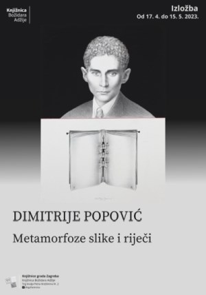 Po prvi puta Dimitrije Popović izlaže u Knjižnici Božidara Adžije i to plakate, unikatne likovne monografije s originalnim grafikama, kao i originale razglednica iz privatne zbirke mr. sc. Bože Biškupića, svoje osobne predmete, rukopise i skice.