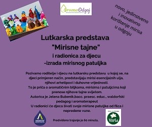 Pozivamo roditelje i djecu na lutkarsku predstavu u kojoj se, na djeci primjeren način, predstavljaju mirisi esencijalnih ulja, njihovi arhetipovi i duhovne vrijednosti.