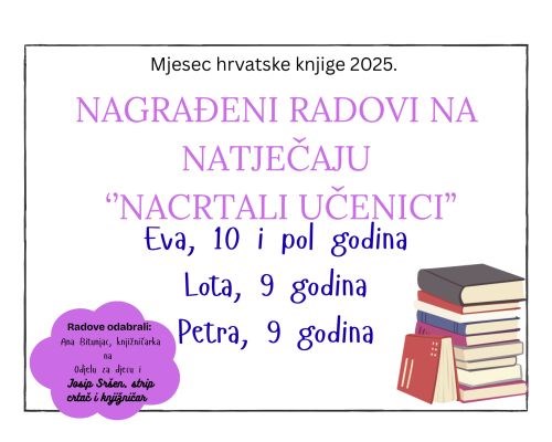 Na Odjelu za djecu izloženi su likovni radovi osnovnoškolaca pristiglih na natječaj ''Nacrtali učenici'' povodom Mjeseca hrvatske knjige 2025. u kojem su u fokusu knjižničari.Na natječaj je pristiglo 45 dječjih radova.