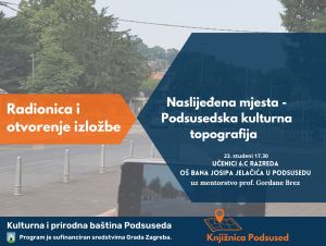 Kreativnom radionicom s učenicima šestog razreda izradit ćemo izložbu.Učenici su fotografirali materijal za izradu interaktivne mape kulturnog krajolika Podsuseda. Na radionici u Knjižnici Podsused fotografije će dobiti opis i oznaku na karti. Izložbu fotografija moći ćete pogledati u Knjižnici Podsused. Radionica je dio programa Kulturna i prirodna baština Podsuseda.