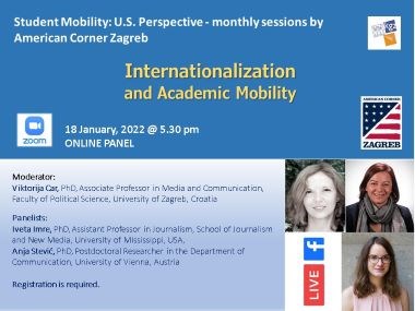 American Corner Zagreb hosts Viktorija Car, an Associate Professor in Media and Communication, at the Faculty of Political Science, the University of Zagreb, Croatia, for an online panel: Internationalization and Academic Mobility with the two panelists Iveta Imre, an Assistant Professor in Journalism in the School of Journalism and New Media at the University of Mississippi, USA, and Anja Stević, a Postdoctoral Researcher in the Department of Communication at the University of Vienna, Austria.The program is organized by American Corner Zagreb as part ''Student Mobility: U.S. Perspective'', a series of monthly sessions by American Corner Zagreb (October 2021-September 2022) supported by U.S. Embassy Zagreb.