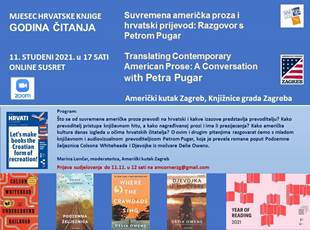 U Godini čitanja i u okviru Mjeseca hrvatske knjige gostovat će Petra Pugar, književna prevoditeljica i doktorandica na studiju znanosti o književnosti, teatrologije i dramaturgije, filmologije, muzikologije i studija kulture na Filozofskom fakultetu u Zagrebu, u online susretu pod naslovom Suvremena američka proza i hrvatski prijevod.Za sudjelovanje putem Zooma prijavite se do 11. studenog 2021. u 12 sati na email adresu amcornerzg@gmail.com.