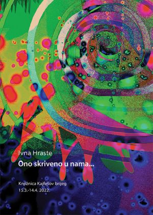 Izložba slika Ivne Hraste.Ivna Hraste, grafička i web dizajnerica, rođena je 1976. godine u Zagrebu. Nakon završene V. gimnazije, diplomirala je na Studiju dizajna pri Arhitektonskom fakultetu u Zagrebu, gradu u kojem živi i radi. Sudjelovala je u organiziranju i provedbi brojnih likovnih događanja i izložbi, a vodi i kreativne radionice mokrog i suhog filcanja pod nazivom „E, a kak se filca?“. Izlagala je na 11 grupnih likovnih izložbi u Hrvatskoj predstavljajući fotografije, crteže, kompjutorske Grafike, te nakit i skulpture/instalacije od vune. Na prvoj samostalnoj izložbi predstavljala je akvarele i miješanu tehniku na papiru. Ovaj put predstavlja apstraktnu digitalnu umjetnost - kompjutorske grafike.