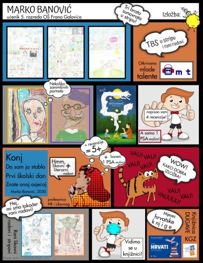 U sklopu projekta Otkrivamo mlade talente pogledajte i pročitajte izložbu TBS u stripu i rani radovi, autora Marka Banovića, učenika petog razreda OŠ Frana Galovića. Likovni i literarni radovi bit će postavljeni u prostoru knjižnice od 15.11. do 15.12.2021. Uživajte i inspirirajte se Markovom kreativnošću, dođite u knjižnicu i ne zaboravite zaštitnu masku! Poslušajte intervju s Markom u emisiji Pet za pet u ponedjeljak, 29.11.2021. u 13:45 na 1. programu HR. - radio.hrt.hr