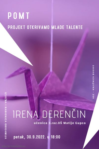 Pozivamo vas na radionicu origamija za učenike nižih razreda osnovne škole koju će održati Irena Derenčin, učenica trećeg razreda OŠ Matije Gupca. Izložbu Ireninih origamija moguće je razgledati u prostoru knjižnice do sredine listopada. Pogledajte Ireninu prvu samostalnu izložbu Likovi iz najdražih slikovnica, postavljenu virtualno i u prostoru knjižnice u sklopu projekta Otkrivamo mlade talente, 2021., te pročitajte njezine recenzije. Pridružite nam se!