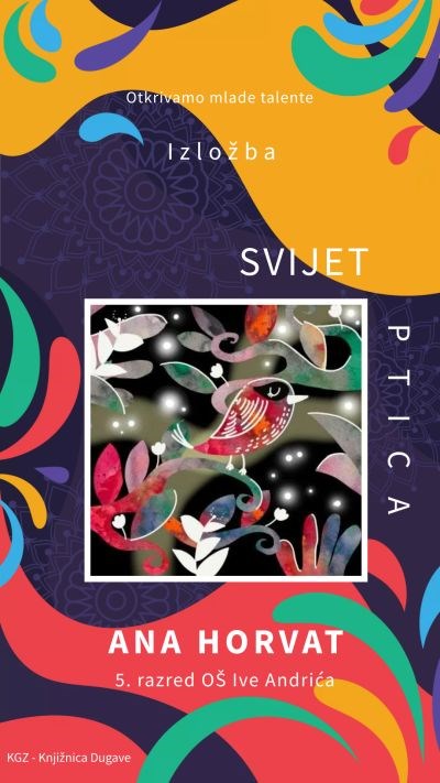 Izložba likovnih radova i istraživačkog art dnevnika Svijet ptica, autorice Ane Horvat, učenice petog razreda OŠ Ive Andrića, Zagreb. Izložba je dostupna virtualno na našim web stranicama te u prostoru knjižnice od 15. siječnja do 10. ožujka. - Virtualna mjera 99
