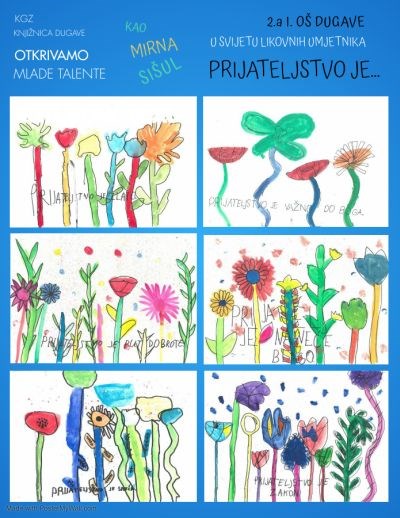 Misli o prijateljstvu učenika 2.a razreda I.OŠ Dugave upisane na kreativne radove nastale po uzoru na umjetnicu Mirnu Sršen, upisat će se u vaša srca i na trenutak ćete pomisliti kako je život lijep. Radove možete pogledati na stražnjim prozorima Odjela za djecu i mlade do 5. srpnja ili u priloženoj virtualnoj galeriji: Prijateljstvo je...