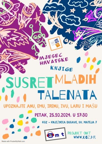 Pridružite nam se na Susretu mladih talenata i upoznajte učenice petih i šestih razreda osnovnih škola. U neformalnom predstavljanju i razgovoru otkrit će nam svoje talente, a vi im možete postavljati pitanja i podijeliti dojmove o njihovom kreativnom radu. Nadahnite se i postanite budući sudionici projekta Otkrivamo mlade talente ili samo uživajte i podržite kreativnost drugih! "Ne možete potrošiti kreativnost. Što je više koristite, to je više imate!" - Maya Angelou
