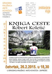 Predstavljanje knjige Knjiga ceste autora Roberta Koletića u četvrtak, 26. veljače 2015. u 18,30 sati. Gradska knjižnica Ante Kovačića predstavit će zaljubljenika u putovanja Roberta Koletića, autora Knjige ceste, koji će nam dočarati svoje putovanje motorom oko svijeta na kojem je proveo 120 dana i prešao 43 000 kilometara.