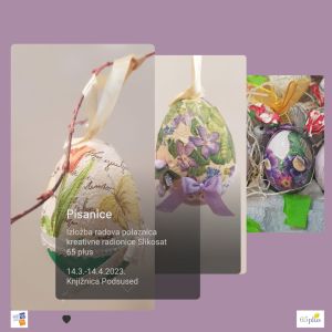 Polaznice radionica Slikoksat u sklopu projekta 65 plus Knjižnica Grada Zagreba Knjižnice Podsused, ručno rađene pisanice izrađivale se tijekom proteklih nekoliko godina.Izložbom vas pozivamo da nam se pridružite na kreativnim radionicama za odrasle svakog drugog utorka u mjesecu.