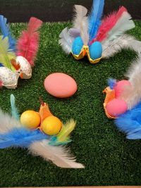 Tehnika: reciklirana kutija od jaja, tempera, raznobojno perje
