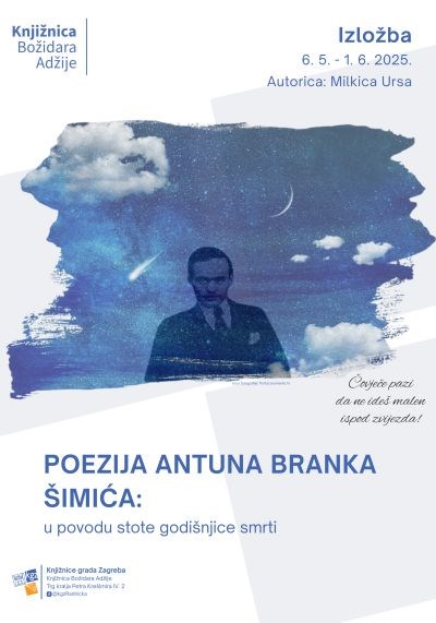 U Studijskoj čitaonici Knjižnice Božidara Adžije izložbom Poezija Antuna Branka Šimića: u povodu stote godišnjice smrti obilježava se sjećanje na ovog pjesnika ekspresionizma, jednog od začetnika hrvatske moderne lirike. Uz knjižni izlog Šimićevih djela, prijevoda i sabranih djela, izloženi su časopisi koje je uređivao i u kojima je objavljivao (Književnik, Savremenik) te zapisnik s tribine Književni petak, koji je dio knjižničnog fonda. Na književnoj tribini Poezija A. B. Šimića iz 1966. godine o Šimićevoj poeziji govorio je književni kritičar Marin Franičević, a njegove bilješke za predavanje moći će se razgledati uz izložbu.Putem poveznice dostupan je popis izložene građe na mrežnom katalogu Knjižnica grada Zagreba i popis djela za posudbu.