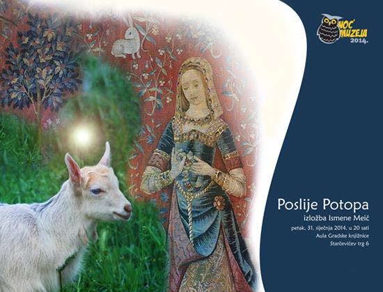 Noć muzeja 2014 u auli Gradske knjižnice u Zagrebu - izložba Poslije Potopa (2012./2013.) autorice Ismene Meić.U konceptualnoj izložbi se rekonstruiraju prostor i vrijeme događaja koji je promijenio našu percepciju stvarnosti. Neki taj događaj nazivaju Velikim Potopom, neki pak rođenjem svijesti. Priča o kraju, o prijelazu, o buđenju. Potop je granica koja dijeli dva vremena i dvije strane - ovostrano i onostrano. Ovo Poslije Potopa, lako se može promijeniti u Prije. Potraga postaje povratak. Stoga i alegorija u kojoj je glavni lik jednorog. Interpretiraju se umjetnički prikazi jednoroga s damom izloženi u Muzeju u Clunyju. Izložba postaje izložba u izložbi. Svaka od šest tapiserija jedna je od slika posvećena nekom od osjetila (okus, sluh, vid, miris, dodir i šesto čulo). Doživljaj slika pokušava izazvati sinesteziju osjetila. Iako se radi o konvencionalnim izlošcima (platno određene dimenzije - otisnuto, oslikano, kolažirano) osjetilnost vizualnog objekta se proširuje materijalima, supstancama i artefaktima koji sugeriraju dodir, okus, miris, sluh… Na tragu izložbe, pozivamo Vas na razgovor o motivima tematiziranim na slikama: pet osjetila i šesto čulo, sinestezija i arhetipsko u umjetnosti, aspekti osjetilnosti u književnosti, slikarstvu, kazalištu; terapeutska uloga umjetnosti (književnost - biblioterapija / Ljiljana Sabljak; slikarstvo - osobno iskustvo / Ismena Meić; kazalište - psihoanaliza i kreativnost / Stanislav Matačić).