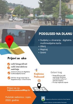 Ukoliko želite sudjelovati u stvaranju sadržaja za multimedijalnu kartu Podsuseda, volite fotografiju i multimedijalne sadržaje, prijavite se na radionice u Knjižnici Podsused ili na e-mail: knjiznica.podsused@kgz.hr do 1. rujna 2022.Poziv za sudjelovanje na radionicama: