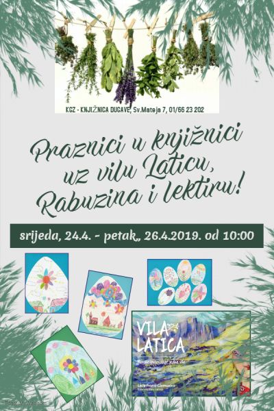 Provedite dio praznika u knjižnici Dugave, nadahnite se poezijom i slikarstvom Ivana Rabuzina, edukativnom slikovnicom Vila Latica autorice Lade Franić - Glamuzina, te ispunite anketni listić o voljenim i manje voljenim lektirama i knjigama. Svi materijali su dostupni u knjižnici. Pridružite nam se!