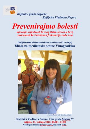 Međunarodni dan sestrinstva (12.5.) obilježavamo akcijom za građanstvo Prevenirajmo bolesti - mjerenje vrijednosti krvnog tlaka, šećera u krvi, zasićenosti krvi kisikom i frekvencije rada srca, u suradnji sa Školom za medicinske sestre Vinogradska (voditeljica Monika Lovrek Seničić, dipl. med. techn.).Uz tu akciju izložene su knjige (medicinske i beletrističke) iz fonda Knjižnice koje obrađuju temu sestrinstva.