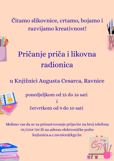 Pozivamo najmlađe korisnike na pričanje priča i likovnu radionicu, redovne aktivnosti na Odjelu za djecu i mlade Knjižnice Augusta Cesarca, Ravnice, koje se održavaju ponedjeljkom od 15 do 16 sati i četvrtkom od 9 do 10 sati.