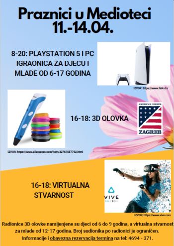 Tijekom proljetnih praznika od 11. do 14. travnja 2023. godine u Medioteci će se održavati radionice i igraonica.Radionice 3D olovke namijenjene su djeci od 6 do 9 godina, a virtualna stvarnost za mlade od 12-17 godina. Broj sudionika po radionici je ograničen.