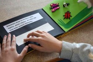 Na izložbi se predstavljaju taktilne, ručno rađene slikovnice reljefnih ilustracija s tekstom na Braillovom pismu i uvećanom tisku koje su u proteklih šesnaest godina izradili knjižničari Odjela za djecu i mladež Gradske knjižnice i djelatnica knjigovežnice Marija Šavorić u sklopu projekta Knjižnica širom otvorenih vrata.Udžbenike na brajici i uvećanom tisku za slijepe i slabovidne učenike (one koji pohađaju nastavu u COO „Vinko Bek" ili u bilo kojoj drugoj školi u Hrvatskoj) – izrađuje i prilagođava Odjel izdavačke djelatnosti na brajici i crnom tisku. Odjel je tijekom dugogodišnje suradnje s Odjelom za djecu i mladež Gradske knjižnice, pripremao i tiskao tekstove za sve taktilne, ručno rađene slikovnice. Centar za odgoj i obrazovanje „Vinko Bek“ predstavlja udžbenik matematike za 1. razred i udžbenik prirode za 3. razred te pojedinačne crteže izdvojene iz raznih udžbenika: velika slova glagoljice, UNICEF-ov znak, dio slikopriče, prometni znakovi, karta Great Britain, jelenak (kukac) i ura (sat). Na izložbi je predstavljen i jedan učenički rad u kombiniranoj tehnici.