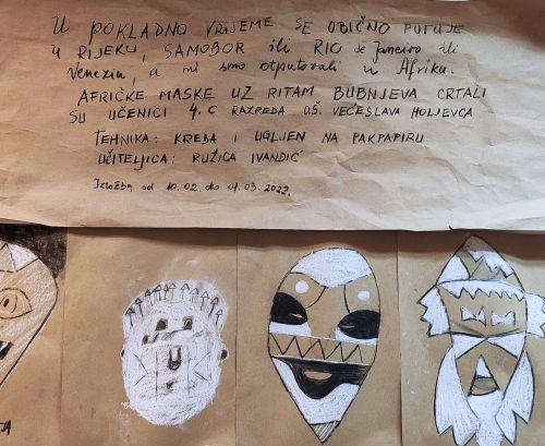 U pokladno vrijeme se obično putuje u Rijeku, Samobor ili Rio de Janeiro ili Veneziu, a mi smo otputovali u Afriku. Afričke maske uz ritam bubnjeva crtali su učenici 4.c razreda OŠ Većeslava Holjevca.Tehnika: kreda i ugljen na pakpapiru