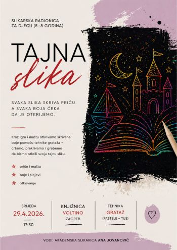Djeca će kroz igru otkrivanja stvarati svoje “tajne slike” koristeći tehniku grataža - slojevito crtanje pastelama koje se prekriva tamnim slojem, a zatim grebanjem otkriva skrivene boje.